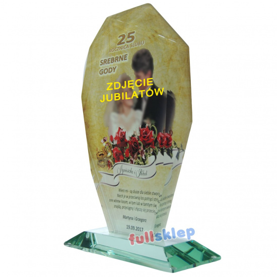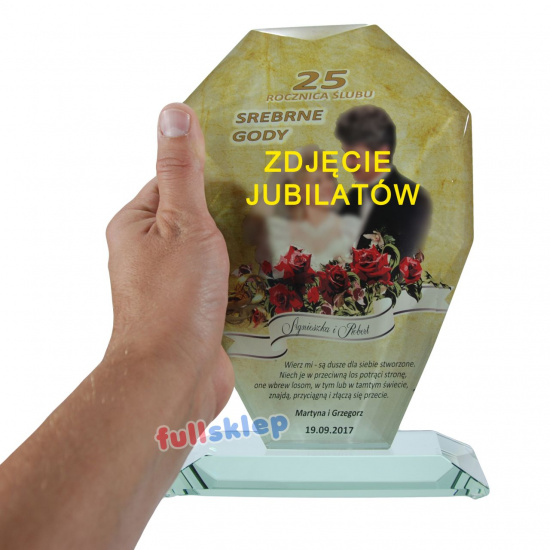 Ta szklana statuetka będzie zachwycającą pamiątką Rocznicy Małżeństwa na długie lata. Statuetka szklana na której możesz umieścić własny nieszablonowy tekst życzeń oraz fotografię czarno białą albo w kolorze osób obchodzących jubileusz ślubu.